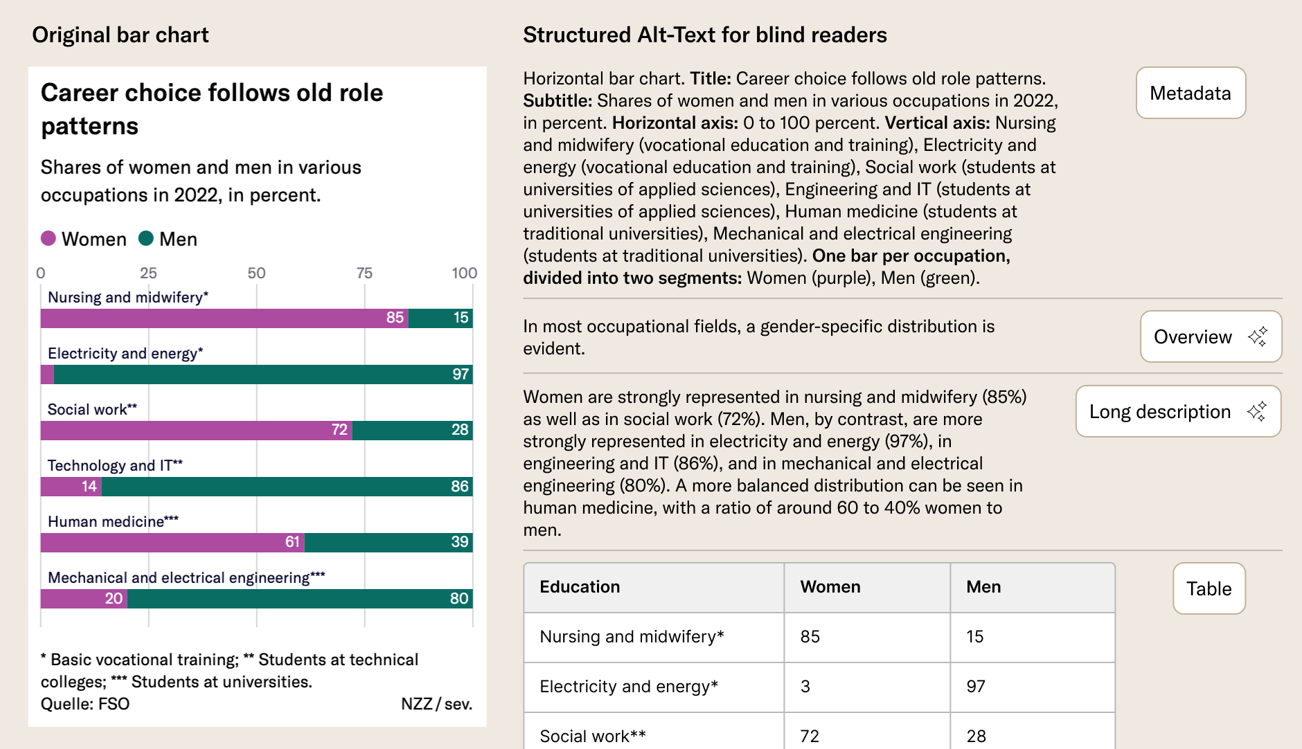 So they created their own. In collaboration with a linguist and blind people recruited through the newsletter of the SBV, they wrote 41 gold-standard-texts matched to NZZ charts.