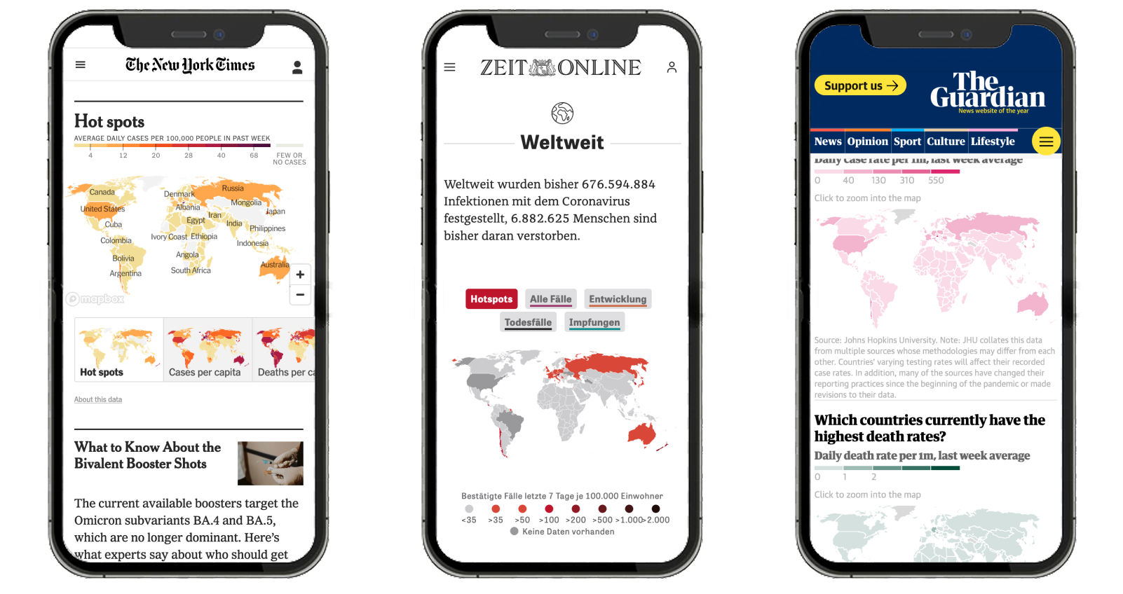With these issues in mind, we set out to redesign thematic maps at NZZ. The challenge became especially urgent during the COVID-19 pandemic, when demand for global maps spiked. As a first step, we identified two dominant types of thematic maps in our reporting: