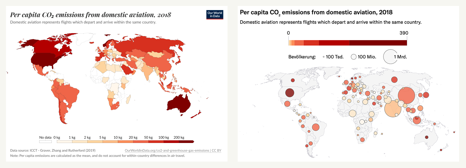 Beyond the inefficient use of mobile screen space, online publications also lean heavily on choropleth maps to show population-related data – like “Per capita CO₂ emissions from domestic aviation.” This is despite decades of research showing how choropleths distort perception. These maps give visual weight to large, sparsely populated countries like Russia or Australia, while minimizing countries like Bangladesh or the Netherlands. The result? Readers walk away with a skewed impression. In this example, readers are likely to strongly overestimate emissions from domestic aviation as you can see in the comparison.