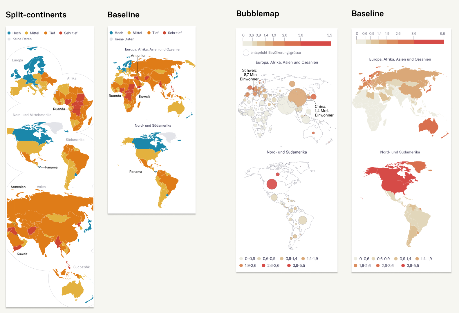 Most world maps you see online are not really designed for mobile screens. They're too small and require interaction to see countries like Switzerland. At NZZ, we wondered if we could come up with a design that works better. In a large user study, we showed that our redesigned world map improves readability – especially for small countries. We also found that using bubbles sized according to population, rather than land area, led to interpretations that more accurately reflected the underlying data.